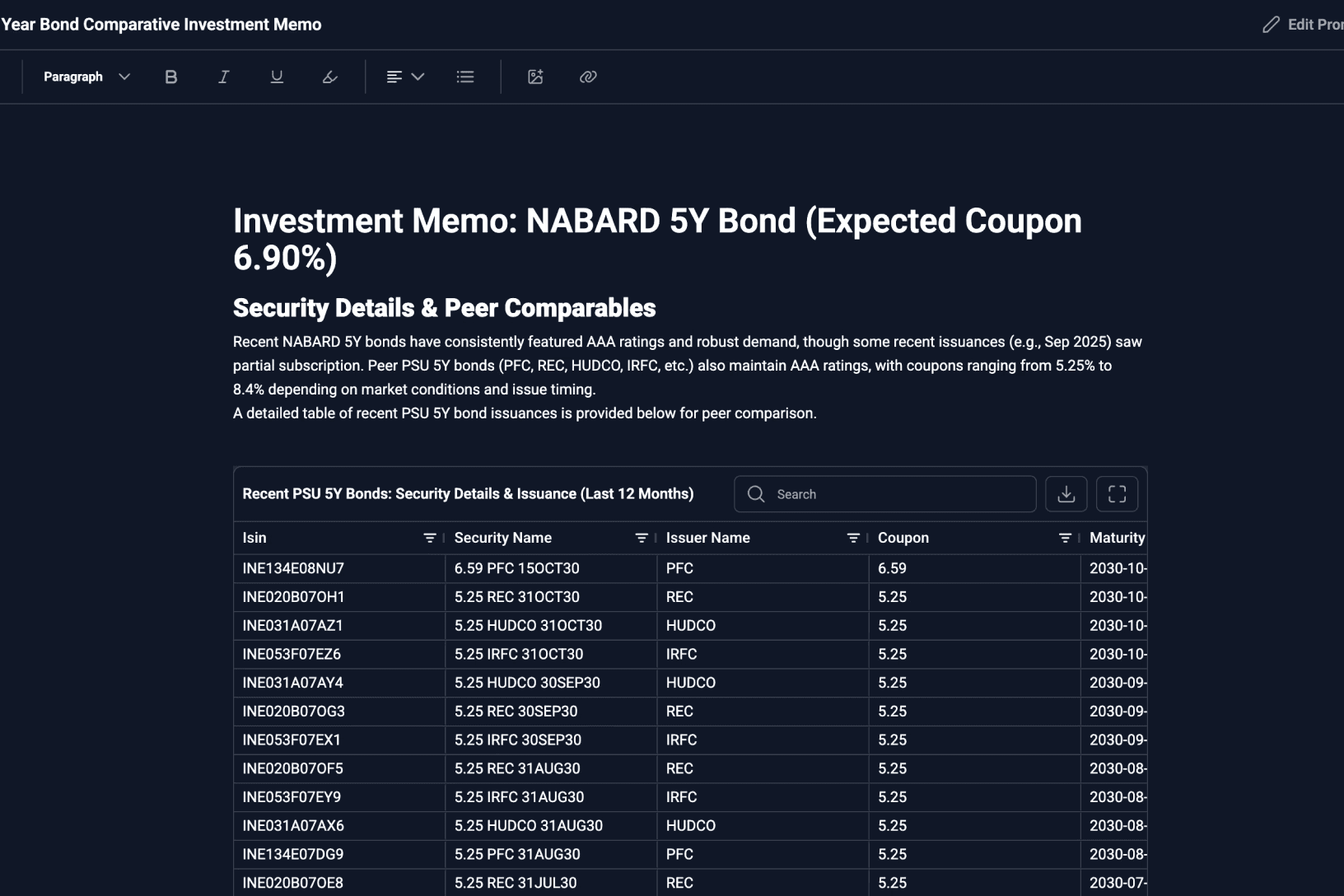 Automate daily market summaries, investment memo, client reports or create your own custom reports